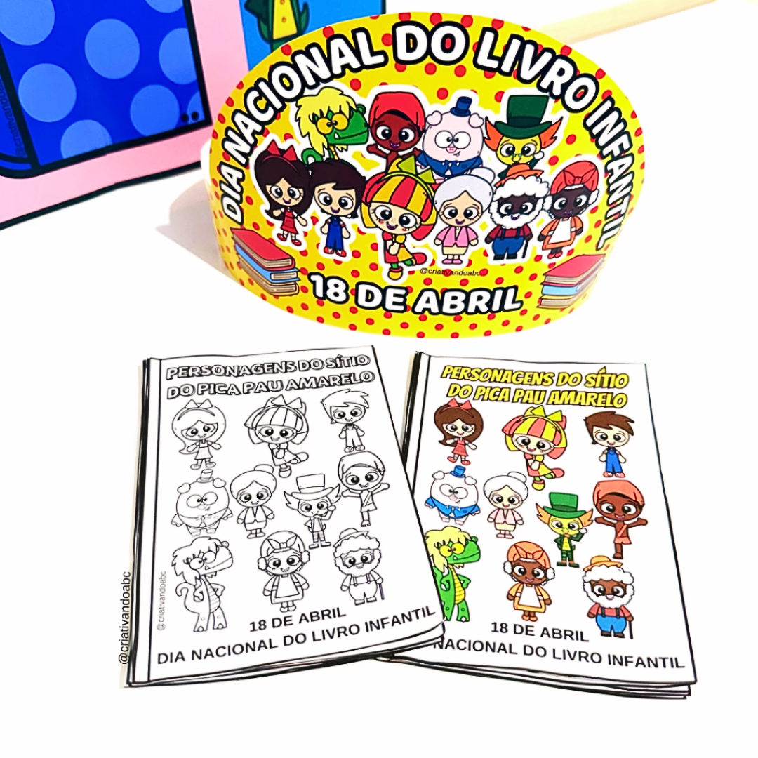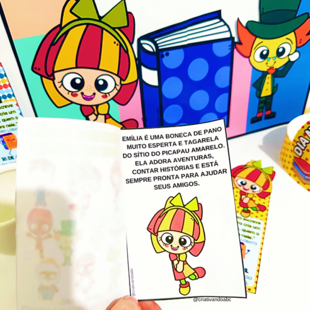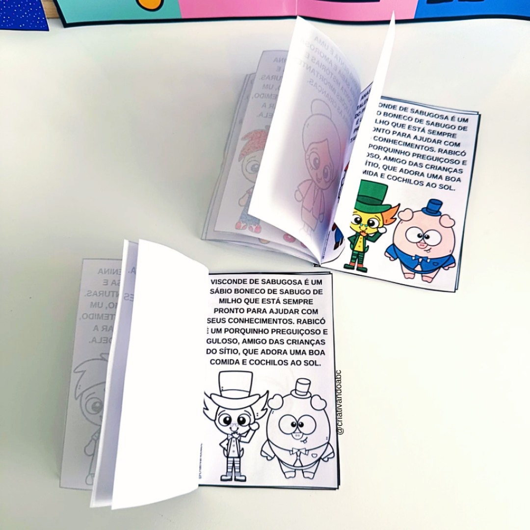 ✨ Para montar 1 livrinho que apresenta todos os personagens, Emília, Narizinho, Pedrinho, Dona Benta, Saci, Cuca, Tia Nastácia, Tio Barnabé, Visconde de Sabugosa e Rabicó, você utilizará apenas duas folhas no tamanho A4.