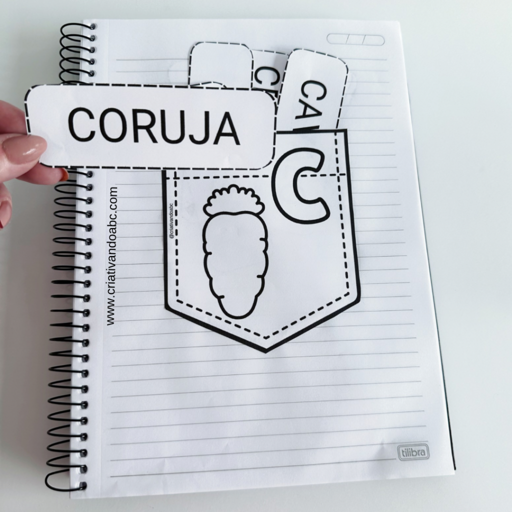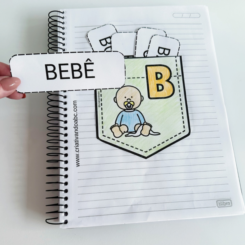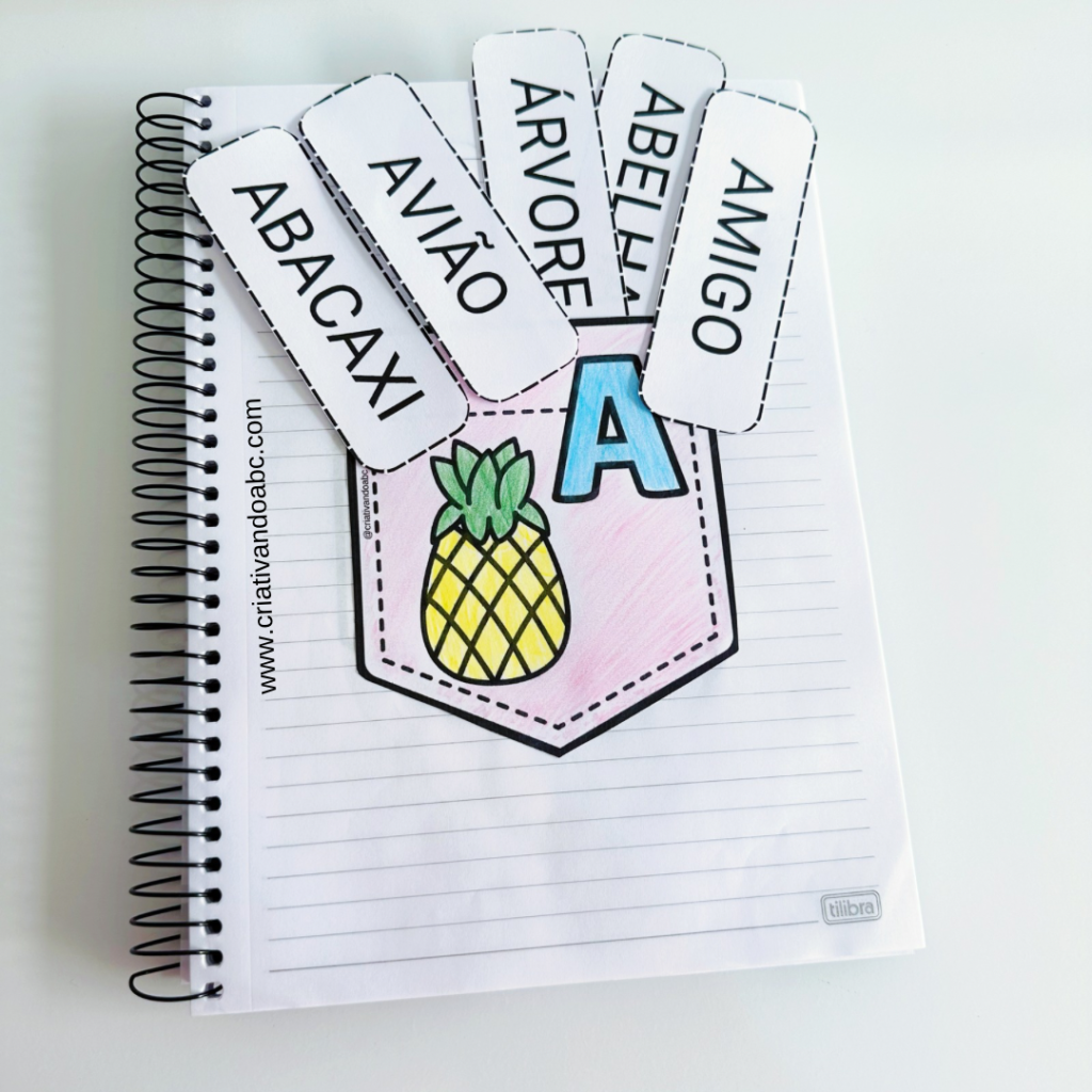 • Cada atividade contém um bolsinho com uma letra, uma figura que começa com essa letra e cinco palavras que também iniciam com a mesma letra.