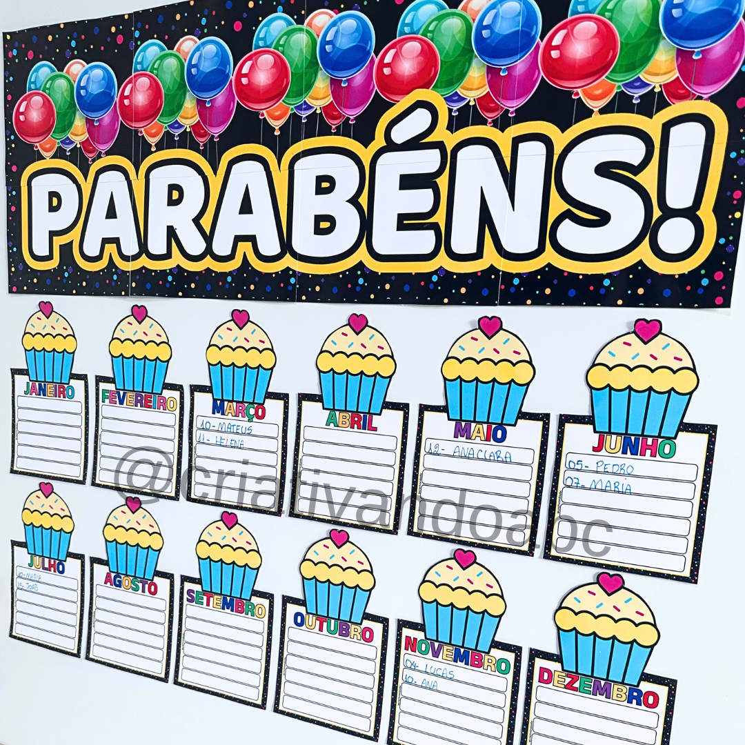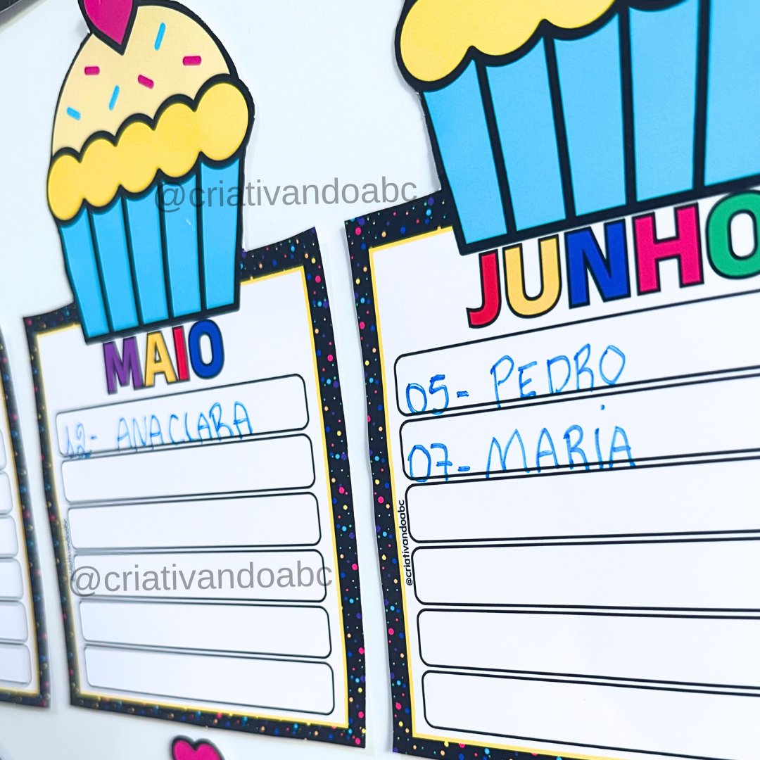 - 12 Plaquinhas, uma para cada mês do ano, decoradas com cupcakes para escrever os nomes dos aniversariantes de cada mês.